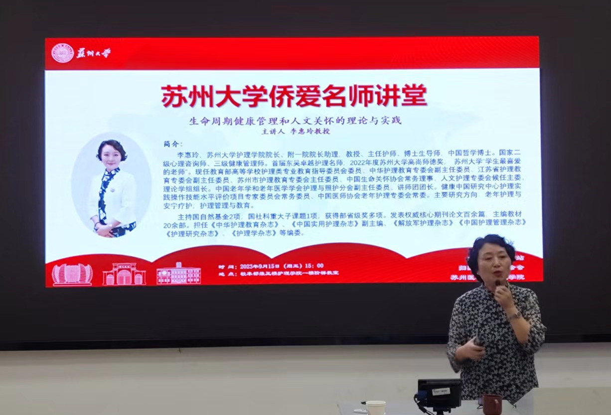 为普及不同年龄段人群的健康管理理念和方法,提高教职工健康生活意识,减少疾病发生,9月15日下午,校为侨服务工作站联合归国华侨联合会及苏州医学院护理学院,在天赐庄校区维正楼举办了2023年度“侨爱名师讲堂”活动,邀请我校护理学院院长李惠玲教授作题为《生命周期健康管理和人文关怀的理论与实践》的健康知识讲座。党委统战部、校侨台联及护理学院相关人员出席活动。活动由校侨联副主席资虹主持。