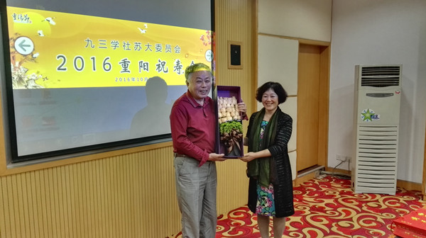 接着,寿星华人德老师与大家分享了早年加入九三学社的经历,娓娓讲述了他工作、学习和书法艺术创作中的感人故事,让大家进一步了解这样一位德才兼备、积极乐观、热爱生活和书法艺术的可敬九三前辈。另一位寿星李承森老师由于居住在国外未能来到现场,九三苏大委员会秘书长王艳老师通过电话向远在加拿大的李老师转达了大家的祝福。随后由谢剑峰秘书长、刘海平副部长向寿星华老师送上寿糕和花篮。