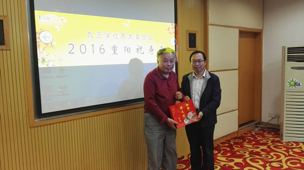 人生易老天难老,岁岁重阳,今又重阳。在这丹桂飘香,金秋送爽的日子里,迎来了一年一度的“九三学社苏大委员会重阳祝寿会”。10月9日下午,在苏大本部红楼会议中心201会议室,九三学社苏大委员会为今年70岁的华人德老师、80岁的李承森老师举行了祝寿活动。九三市委秘书长谢剑峰,校党委统战部副部长刘海平,以及来自6个基层支社负责人和社员共计30余人参加了活动。活动由九三苏大委员会副主委、本部三支社主委王德山老师主持。