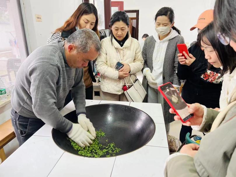 社员们将亲手采摘的茶叶交给制茶师进行炒制。在参观学习杀青、揉制、搓团、显毫等传统制茶工艺的过程中,社员们切身体悟到乡村特色产业发展与文化振兴之间的互促共生,更加深刻理解了习近平总书记所指出的“民族传统文化既是文化又是产业,我们要把这些优秀传统文化传承好、发展好,不仅能够弘扬传统文化,而且能够推动乡村振兴。”