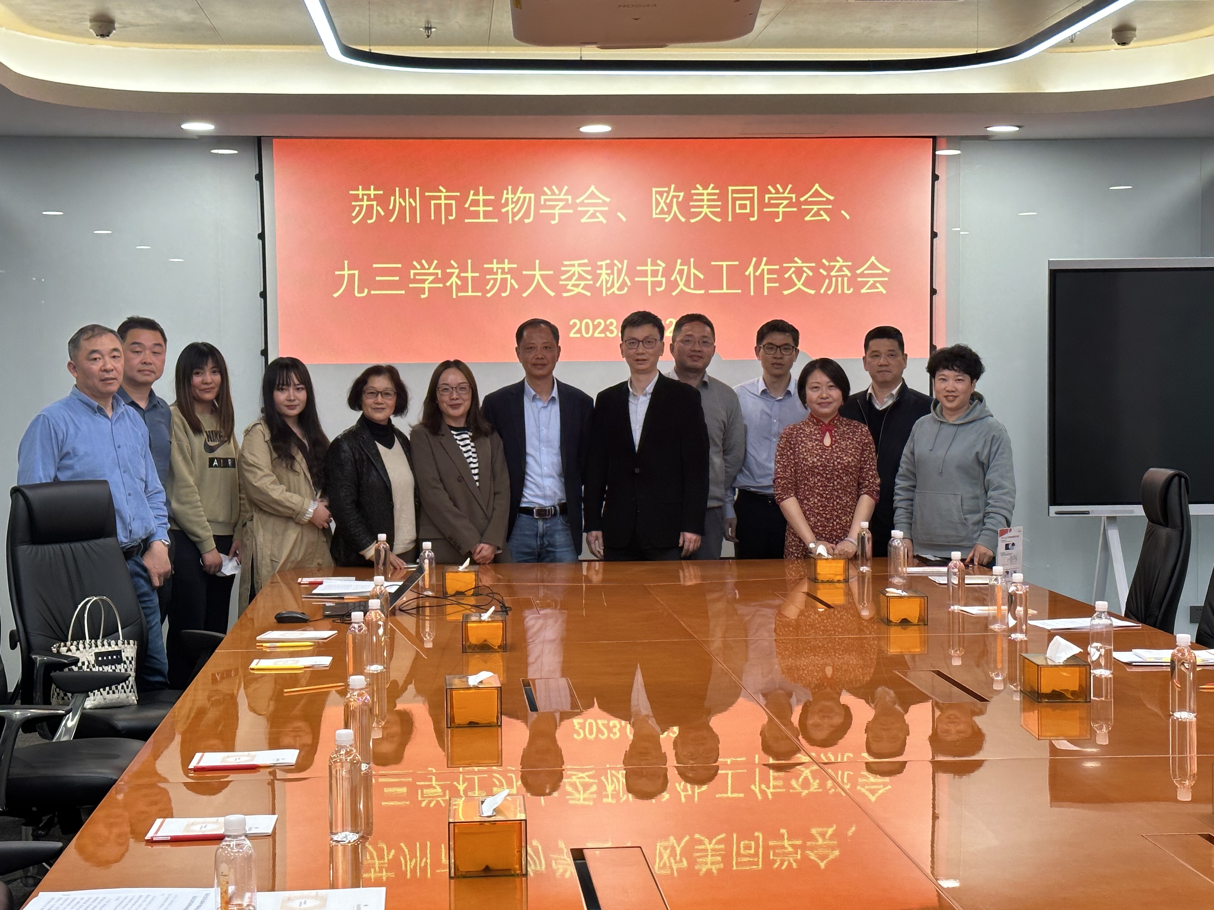 4月2日下午,九三学社苏州大学委员会秘书处、苏州市生物学会、苏州市欧美同学会秘书处在苏州工业园区举行了工作交流会。苏州市生物学会秘书长戈志强、监事长卫功元,苏州市欧美同学会秘书长钟巍,九三学社苏州大学委员会秘书处王艳、苏敏、金国庆参加会议。苏州大学统战部刘海平、韦柠、校长办公室辛颜受邀参加会议。会议由九三学社苏州大学委员会主委、苏州大学欧美同学会常务副会长、苏州市生物学会理事长、苏州市欧美同学会副长苏雄教授主持。