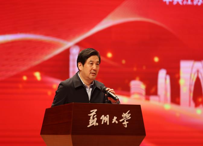 邓飞宣布第三届“铸牢中华民族共同体意识·高校在行动”承办高校为扬州大学。我校党委常委、统战部部长黄志斌和扬州大学统战部副部长毛瑞雪交接会旗。