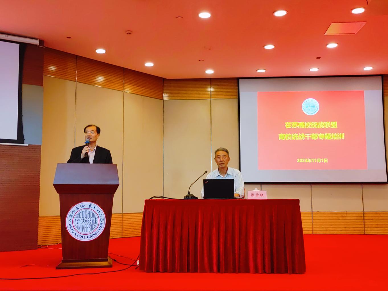 为深入学习贯彻党的二十大精神,贯彻落实习近平总书记关于做好新时代党的统一战线工作的重要思想,加强新时代统战干部队伍建设,11月1日下午,在苏高校统战联盟统战干部第二次专题培训在苏州大学独墅湖校区炳麟学术报告厅举行。全市17所高校近30位统战干部参加培训。会议由苏州大学党委常委、统战部部长黄志斌主持。