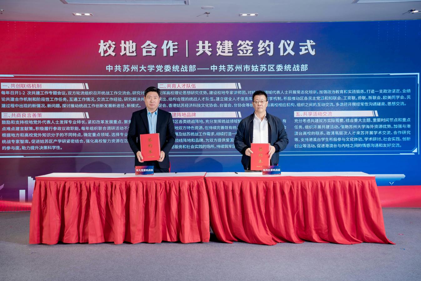 为深入学习贯彻党的二十大精神,落实中央和省委、市委统战工作要求,进一步深化校地统战合作共建,建立组织共建、资源共享、人才共育的交流合作机制,11月15日,苏州大学党委统战部和姑苏区委统战部在姑苏云谷举行了共建签约协议。校党委常委、统战部部长黄志斌,统战部副部长叶明昌出席签约仪式。