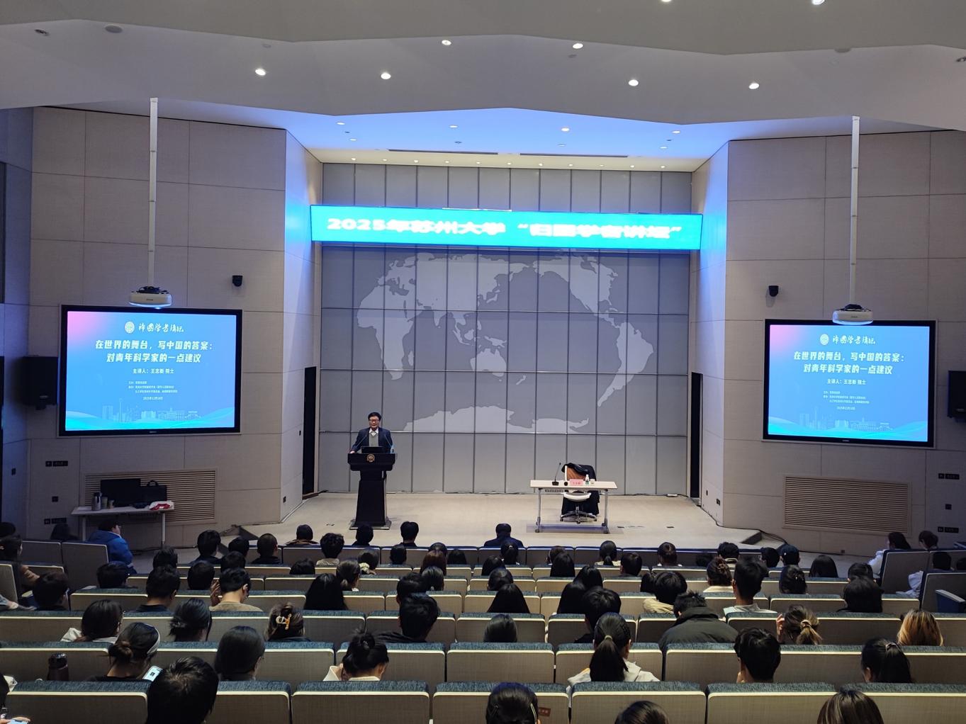 为深入学习贯彻党的二十大和二十届二中、三中、四中全会精神,引领广大青年师生进一步坚定爱国情、践行报国志,12月10日,中国科学院院士、九三学社社员、苏州大学生命科学学院特聘教授王志新应邀主讲我校“归国学者讲坛”。本次活动由我校党委统战部主办,校欧美同学会、九三学社苏州大学委员会、金螳螂建筑学院联合承办。活动由校党委常委、统战部部长黄志斌主持。