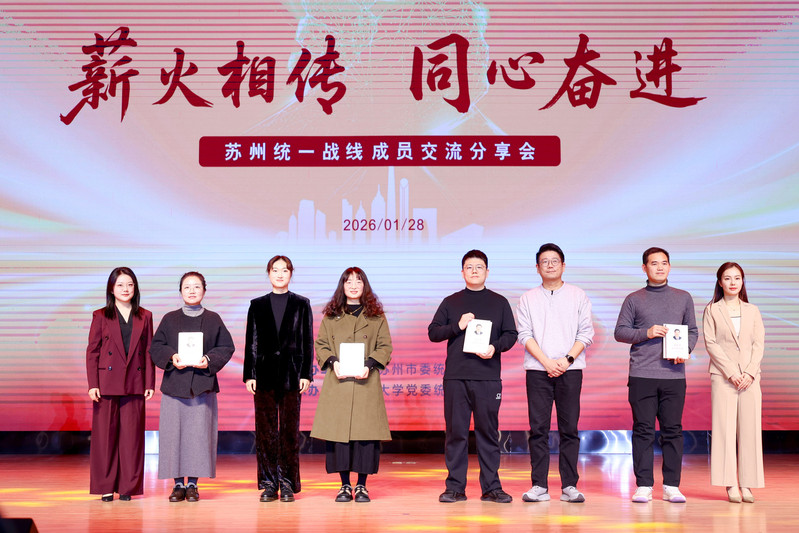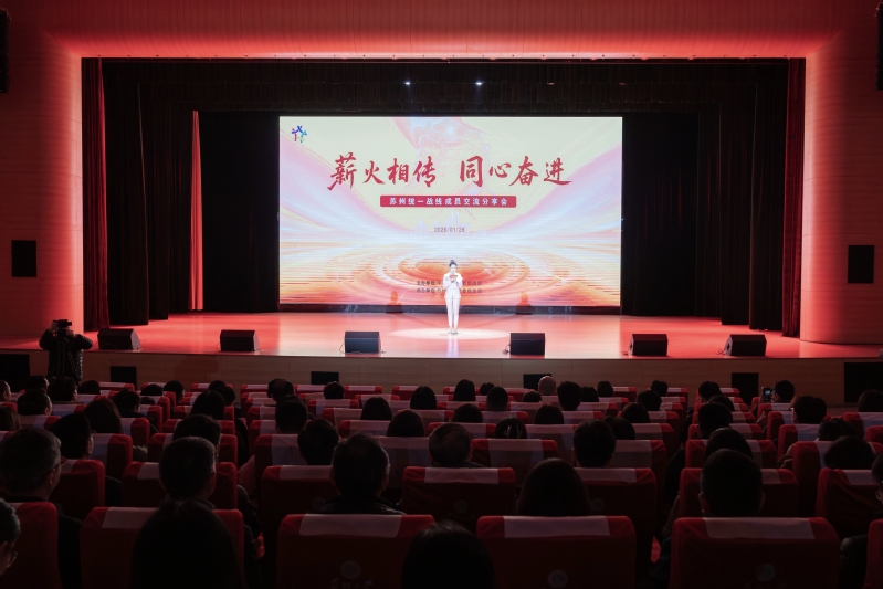 为深入学习贯彻习近平总书记关于做好新时代党的统一战线工作的重要思想和党的二十届四中全会精神,1月28日下午,“薪火相传 同心奋进”苏州统一战线成员交流分享会在苏州大学天赐庄校区举办。市委常委、统战部部长王飏,农工党省委会副主委、苏州大学校长张桥,苏州大学党委常委、纪委书记宫向阳,各民主党派市委会主委朱依东、葛昕、单杰、唐丽艳、张健红、黄靖,市知联会会长李赞,市新联会会长唐海燕,市委统战部常务副部长王燕红等出席活动。