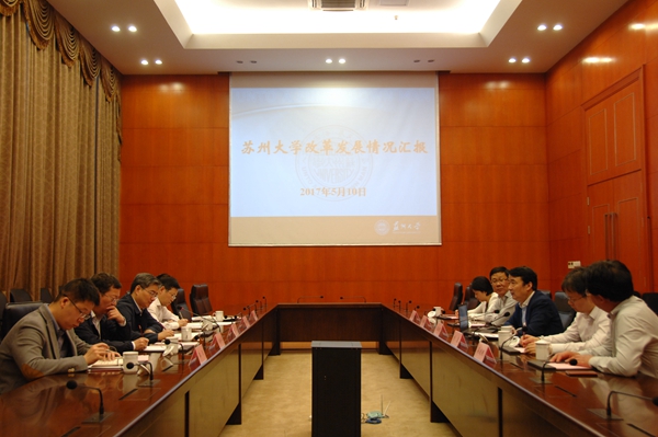 王卓君书记对朱民副书记一行的到来表示欢迎。他从学科建设、师资力量、第三方评价、人才引进、国际合作、科技创新、科研项目经费管理改革、阶段性工作及组织架构、统战建制、党外干部培养等方面介绍了学校近年来改革发展情况、名城名校融合发展战略推进举措以及统战工作概况。王书记指出,今年是名城名校融合发展战略实施的开局之年,苏州大学以“人才强校”为改革发展主战略,按照“卓越行动、原创引领、升级发展、集成创新”的思路,力求与苏州经济社会发展紧密结合,更好地服务于地方经济社会发展。他强调,苏州大学作为江苏省统战工作的重点单位,始终坚持和不断完善党外人士座谈会制度,坚持党员领导干部与党外代表人士联谊交友,坚持在工作中认真听取党外人士意见建议,在重大决策问题上做到事前征求意见建议,事后通报情况,重视选用党外干部,持续加强党外代表人士的培养使用,并于去年建立了党外中青年骨干校内挂职制度。针对今后统战工作的开展,王书记提出四点建议:一是加强党外优秀人才的物色、遴选和培养工作,通过专门培训以提高其政治素质和相关工作能力;二是加大力度选拔优秀人才到基层工作和校外挂职;三是加强对口交流工作,推动协同发展;四是组织高端精品活动,以促进党外优秀人才的培养。最后,他希望学校在建设国内一流、国际知名高水平研究型大学,推进“两聚一高”实践过程中,继续得到市委市政府和统战部的大力支持。
