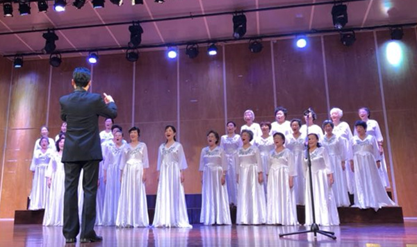 晚上六点半,迎新晚会准时开幕,“春之声”合唱团率先演出,为晚会演奏出华丽的序曲。合唱团首先为大家带来的是女声合唱勃拉姆斯创作于19世纪的著名舞曲《匈牙利舞曲》第五号,接着是男声演唱西部歌王王洛宾改编新疆维吾尔族民歌《青春舞曲》,回味经典名曲,点燃青春激情。随后是用意大利文、俄文和英文演唱的一组世界反法西斯战争的经典金曲《喀秋莎》和《老兵不死》。《喀秋莎》这首曾经见证中苏友谊的歌曲,今天通过中俄等多种语言被演绎,仿佛台上的各位教授又回到了那朝气蓬勃的岁月,又看到教授们坚毅的眼神,像是郑重的把责任交给在做的新一代们。《老兵不死》这首歌是美国西点军校的著名歌曲,歌词中写到老兵永远不会死去,只会慢慢消失喻示老教授们的精神永远不会被磨灭,会在新一代的继承下发扬光大。“春之声”合唱团的风采深深烙印在现场的每一位观众的心中,老教授们唱功精湛、声情并茂,引来阵阵喝彩,将晚会引入高潮。