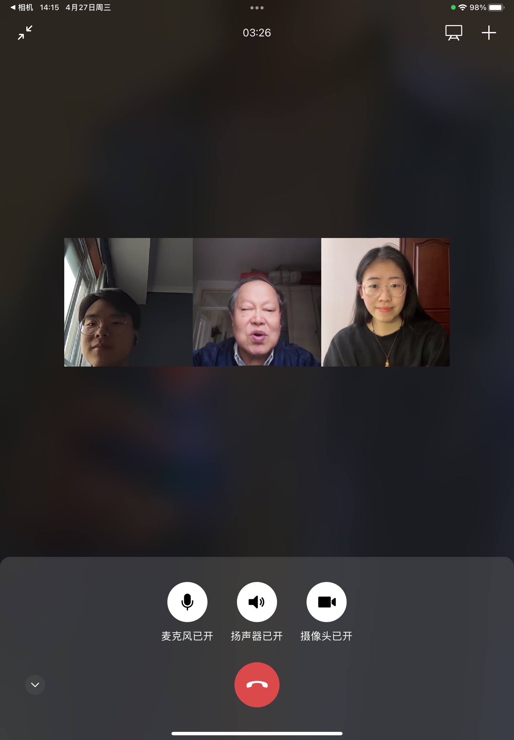 4月27日,张元冲、韦启悦同学也在线上与庄爷爷进行了愉快地交流。从视频交谈中可以看出,爷爷的身体状况很好,志愿者们也充分了解了疫情之下爷爷的日常生活。其中让志愿者们深有感触的是,爷爷非常关心他们的学习状况,并叮嘱他们网课也要认真学习,不能懈怠。同时,爷爷还教导大家上网课之余也应注意多运动、多和家人沟通,以保持健康的体魄和良好的家庭氛围。五十分钟的通话时间不长不短,然而志愿者们和爷爷相谈甚欢,丝毫没有代沟,只觉意犹未尽。