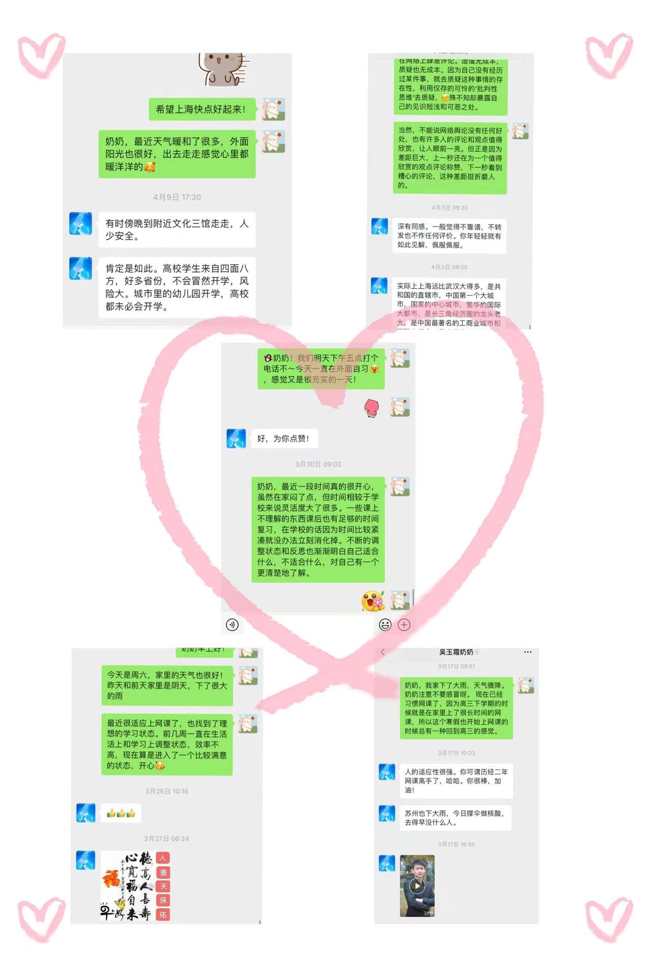在迟迟无法返校的情况下,曹宇同学积极地与吴玉霜奶奶互加了微信,两人在微信上分享各自的生活和感悟。三个多月以来,苏州确诊病例此起彼伏,曹宇时不时提醒奶奶出门做核酸的同时做好防护、非必要不出门,并愿意为其可能遇到的困难提供力所能及的远程帮助。疫情好转之后,奶奶总会在出门散心时热情地将路上所见所闻发给曹宇同学。