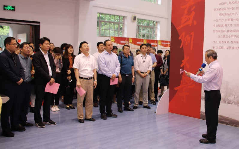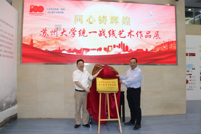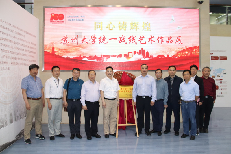 5月26日下午,同心铸辉煌——苏州大学统一战线庆祝中国共产党成立100周年艺术作品展开幕式暨江苏省高校统一战线同心教育实践基地揭牌仪式在天赐庄校区博物馆举行。省委教育工委统群处副处长郝峰,校党委常委、副校长姚建林,校统一战线工作领导小组成员单位、各民主党派、统战团体代表等50余人出席。校党委常委、统战部部长、党委办公室主任薛辉主持仪式。