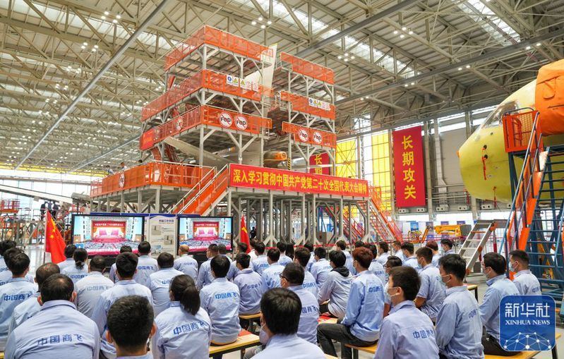 10月16日,在中国商飞上海飞机制造有限公司总装车间,员工们在收看中国共产党第二十次全国代表大会开幕会。新华社记者 丁汀 摄