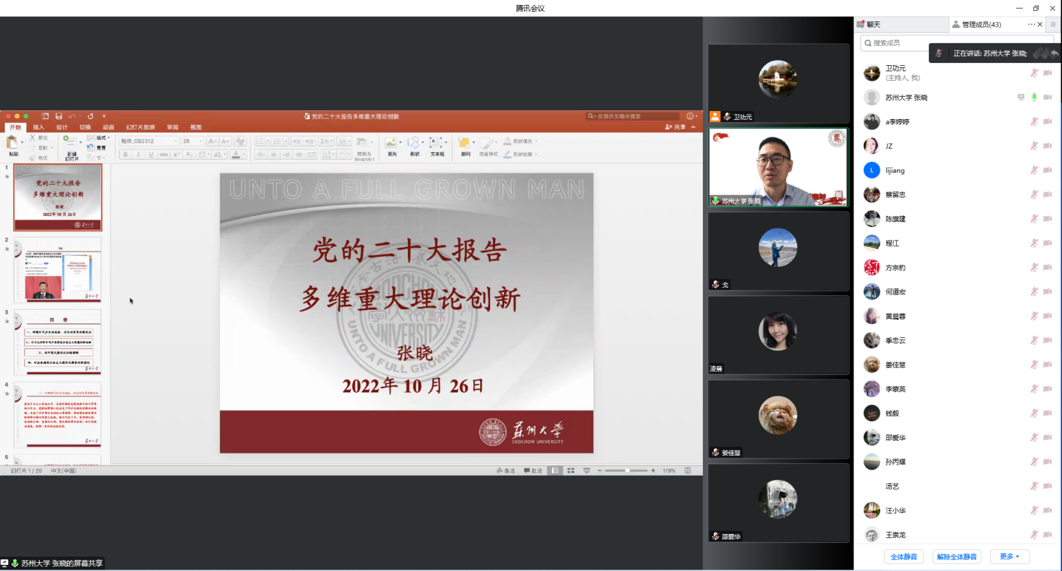 为深入学习贯彻党的二十大精神,10月26日,九三学社苏州大学委员会线上举办了党的二十大报告学习辅导报告会,邀请我校马克思主义学院学科建设办公室主任、马克思主义基本原理概论教研室主任张晓博士作了题为《党的二十大报告 多维重大理论创新》的专题辅导报告。九三学社苏州大学主委苏雄、委员会全体成员和部分社员参加了会议。
