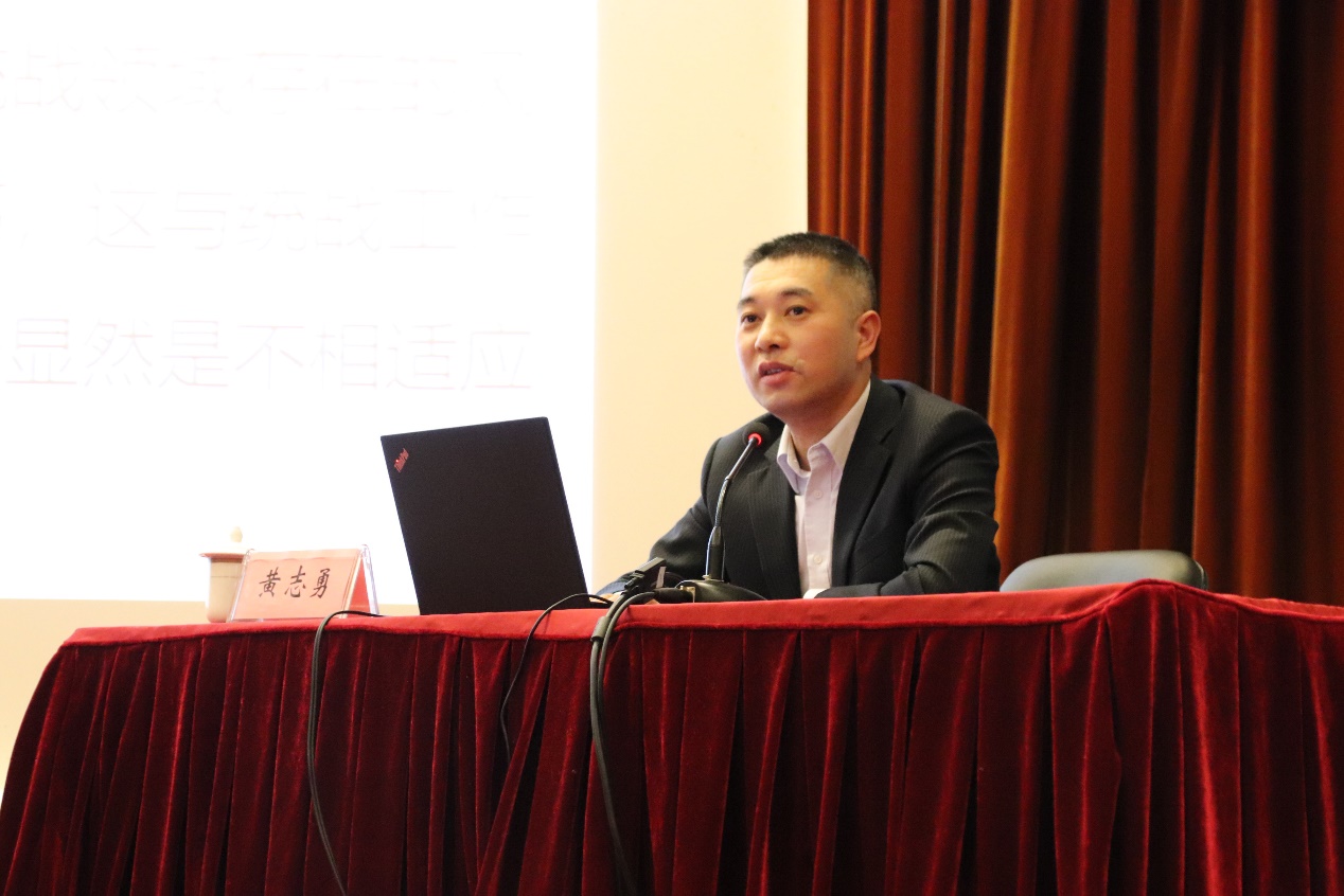 黄志勇以《以习近平总书记关于做好新时代党的统一战线工作的重要思想为指导 深入贯彻统战工作条例 促进统战工作高质量发展》为题,从统一战线的重要地位作用、党对统一战线工作的集中统一领导、各领域统战工作的主要任务和着力点、党外代表人士队伍建设等方面详细阐述了习近平总书记关于做好新时代党的统一战线工作的重要思想,并结合苏州市近年来统战工作的具体实践,对《中国共产党统一战线工作条例》做了全面深入的解读。最后,他结合高校统战工作实际,对高校高质量做好统战工作给予了有益指导。