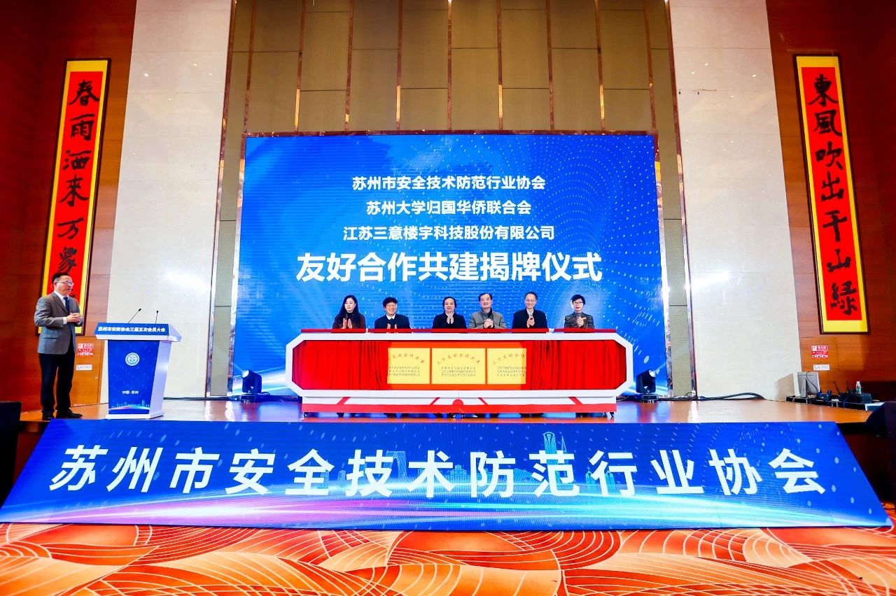 黄志斌、资虹与安防协会、三意集团代表共同为苏州大学归国华侨联合会(简称“苏大侨联”)、苏州市安全技术防范行业协会(简称“苏州安协”)及其会员单位江苏三意楼宇科技股份有限公司(简称“江苏三意”)三方合作共建揭牌。